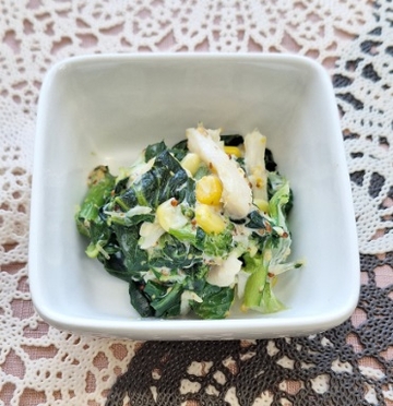 - 2.ブラックペパーマヨを和えたら器に盛り、糸唐辛子をトッピングする。