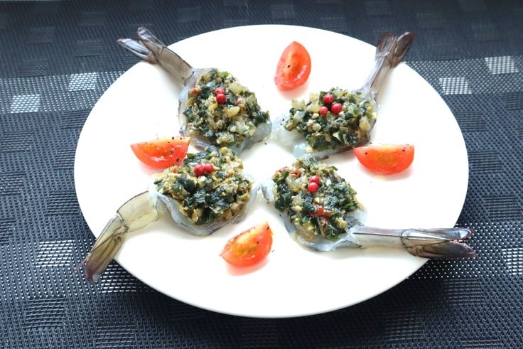 - 2.かつおうめと和え、器に盛り、紅えびをのせる。